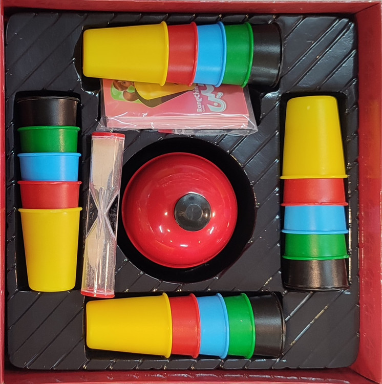 محتویات بازی:۱ عدد ساعت شنی،۱عدد زنگ،۲۰عدد لیوان رنگی،۲۴عدد کارت بازی