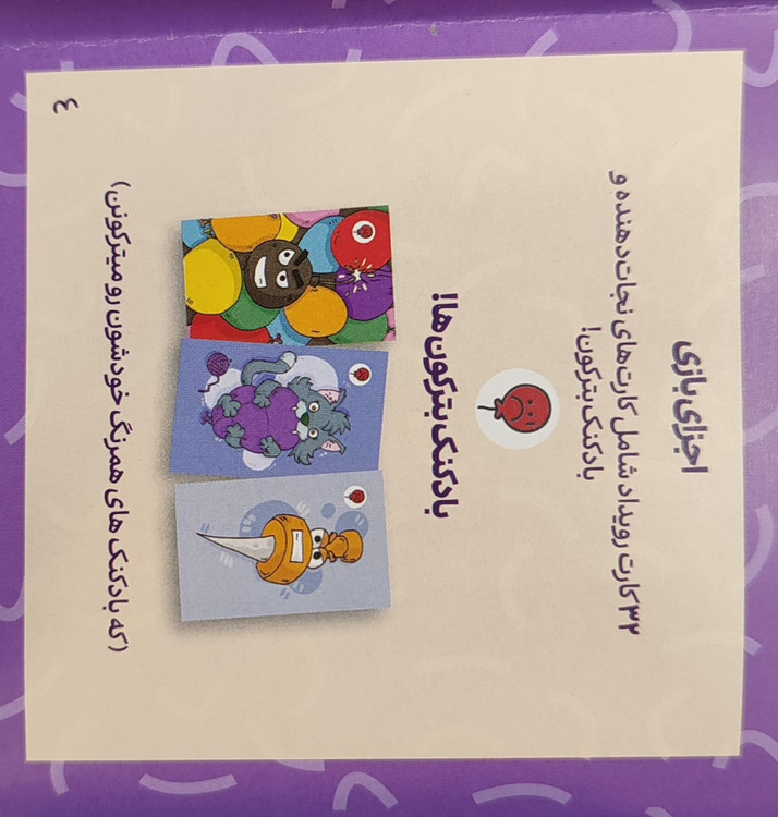 اجزای بازی:۳۲ کارت شامل کارت های نجات دهنده و بادکنک بترکون