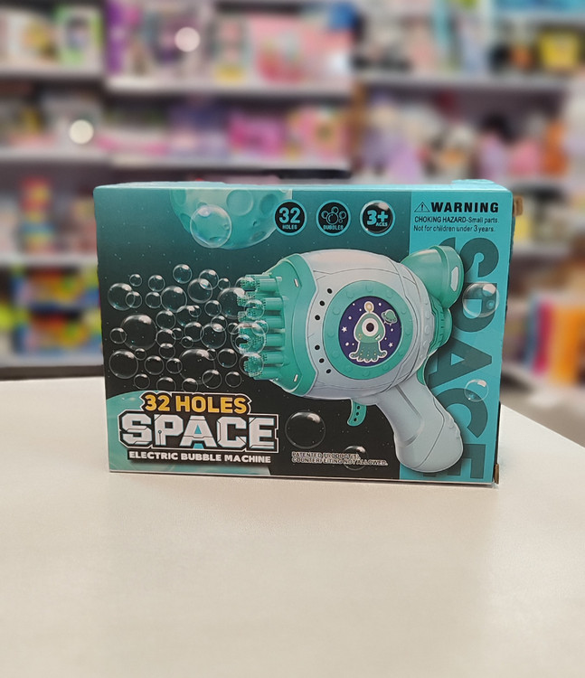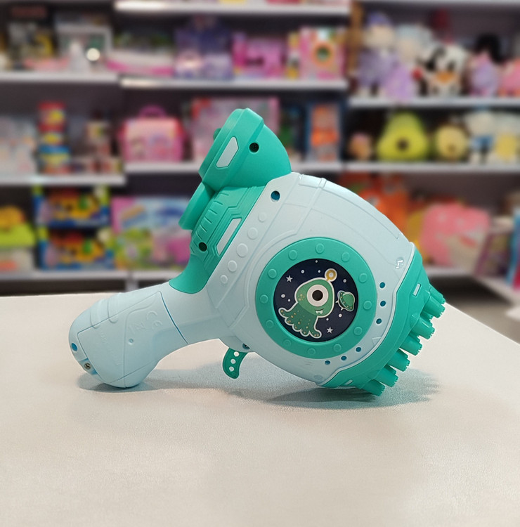 حبابساز رگبار فضایی این تفنگ حبابساز از جنس پلاستیک است و با باتری کار میکند (معمولاً باتری قلمی AA).